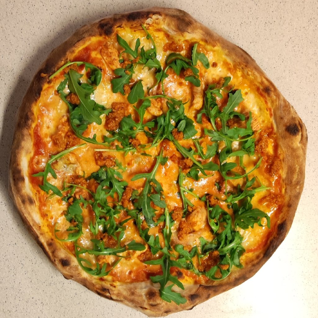 Rajčata Strianese, fresh fior di Latte, kuřecí prsa, sýr gorgonzola, rukola, pesto ze sušených rajčat San Marzano