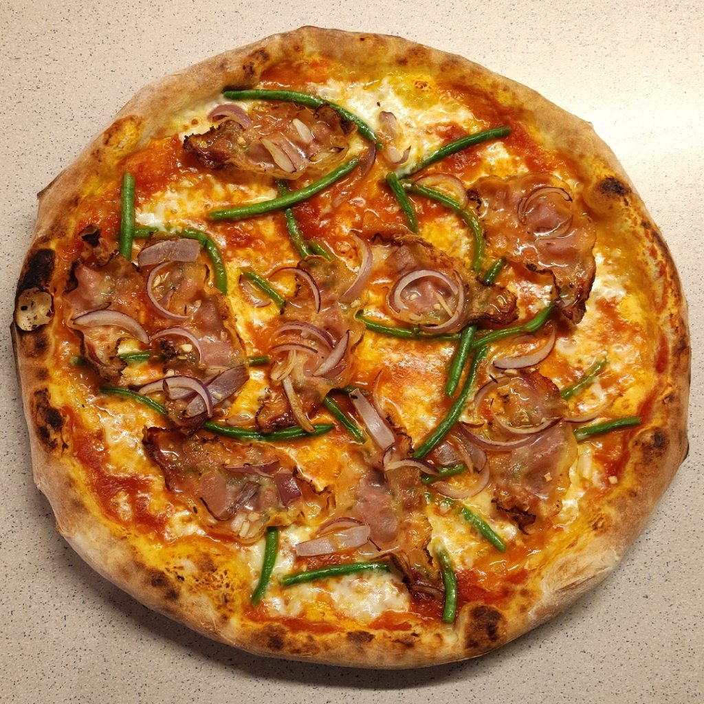 Rajčata Strianese, fresh mozzarella fior di latte, zelené fazolky, guanciale (italská slanina), červená cibule, česnek
